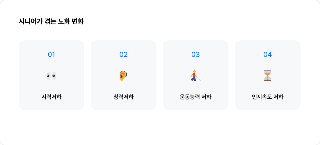 많은 디자이너들은 앞단에서 말한 것처럼 ‘시니어도 이제 스마트폰을 잘 쓰지않을까? 굳이 별도의 UX/UI 기준이 필요할까?’라는 생각을 할 수도 있습니다. 과연 그럴까요? 시니어만의 UXUI 기준이 필요한 이유는 단순한 ‘디지털 적응’이 아닌, 노화라는 인간의 불가피한 변화 때문입니다.아무리 디지털에 익숙해졌다고 해도 나이가 들면 누구나 피할 수 없는 변화가 찾아옵니다. 젊을 때는 전혀 문제가 되지 않던 글자 크기, 버튼의 위치, 정보 처리 속도 등이 어느 순간 큰 장벽으로 다가 오는 것이죠. 실제로 다양한 의학 연구에서는 60대 이후부터는 시력, 청력, 인지 능력의 저하가 가속화된다고 합니다. 그렇기 때문에 시니어 세대가 디지털 서비스에서 불편을 겪는 이유는 단순히 ‘디지털 학습’에 대한게 아니라 노화로 인한 신체와 인지 능력 변화로 인한 것입니다. 이러한 변화는 구체적으로 다음과 같이 나타납니다.