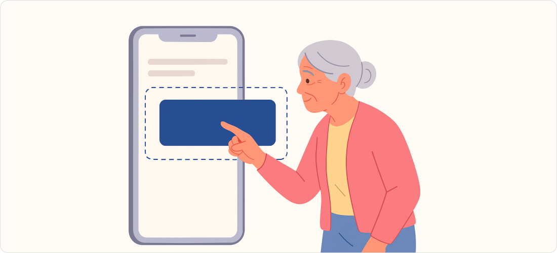 나이가 들면 손가락의 미세한 움직임이 예전 같지 않습니다. 손이 떨리거나, 터치 정확도가 떨어지기도 하죠. 그런데 작은 버튼이 빽백하게 붙어 있다면 어떻게 될까요? 한 번 누를 때마다 잘못 눌러서 뒤로가고, 다시 앞으로 가고… 금세 피로감이 몰려오기 일수입니다. 그래서 시니어 UX/UI에서는 버튼이나 탭, 링크 같은 조작 가능한 영역을 넉넉하게 확보하는 게 기본입니다. 국제 접근성 기준에서는 최소 44픽셀(약 1cm) 크기의 터치 영역을 권장합니다. 버튼 사이도 적당히 띄워야 실수 입력을 줄일 수 있답니다!