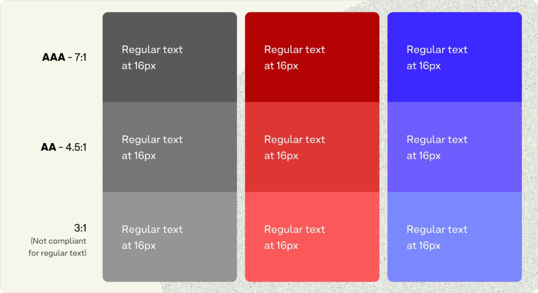 WCAG 기준으로는 텍스트와 배경의 대비 비율을 최소 4.5:1 이상을 확보해야 합니다. 그리고 시각적 구분 요소를 색상으로 주지 않는 것도 핵심입니다! 색을 잘 구분하지 못하는 경우를 대비해 굵기, 아이콘, 패턴 등을 함께 활용하는 것이 좋습니다.