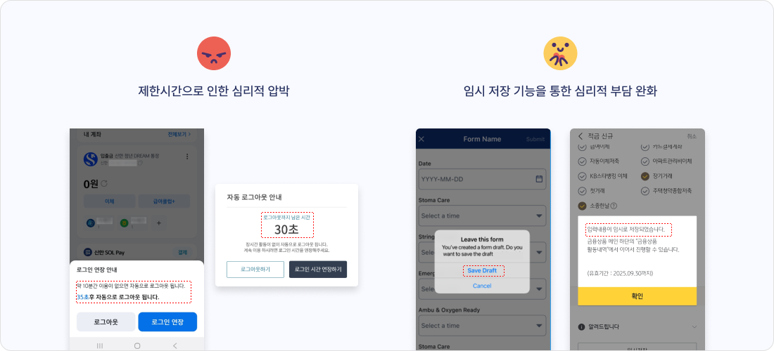 젊은 사용자에게는 빠른 속도의 애니메이션이나 짧은 제한 속도는 큰 문제가 되지 않습니다. 하지만 시니어는 반응 속도가 느려지고 화면의 변화를 따라잡기가 힘들어 혼란을 야기할 수 있습니다. 따라서 시니어에게는 충분한 시간과 여유를 제공하는 것이 중요한데요! 예를 들면 자동 로그아웃이나 입력 제한 시간은 최소 몇 분 이상 넉넉하게 준다던지 또는 복잡한 입력이 필요한 경우 임시저장 기능을 두어 중간에 끊겨도 이어서 할 수 있도록 해야합니다.
