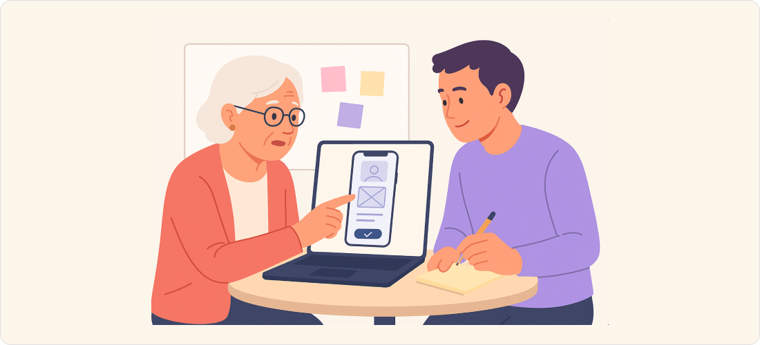 3. 사용자 관찰 테스트 제일 정확하고 확실한 테스트는 직접 시니어 사용자를 초대해 관찰하는 것입니다. 디자이너가 보기에는 완벽해 보이는 화면이겠지만 사실 실제 시니어가 써보면 전혀 예상치 못한 곳에서 막힐 수 있습니다. 시나리오 기반의 과제를 시니어에게 주고 지켜보면서 어디서 시간을 많이 쓰는지, 어디서 터치 오류가 발생하는지 등을 직접 눈으로 확인할 수 있습니다.