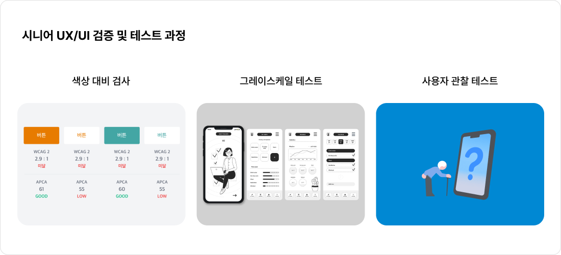 그렇다면 시니어 UX/UI 원칙대로 잘 만들어졌을까? 앞서 원칙에 대한 이야기를 했지만 사실 원칙만 세운다고 해서 곧바로 좋은 UX/UI가 되는 건 아닙니다. 중요한 건 그 원칙이 실제로 도움이 되고 있는지, 제대로 시행이 됐는지 확인이 필요합니다. 마지막 검증을 할려면 어떤 테스트를 진행해야할까요?테스트를 위해서는 실제 시니어의 신체 및 인지 특성을 반영한 테스트 도구와 과정이 필요합니다.
