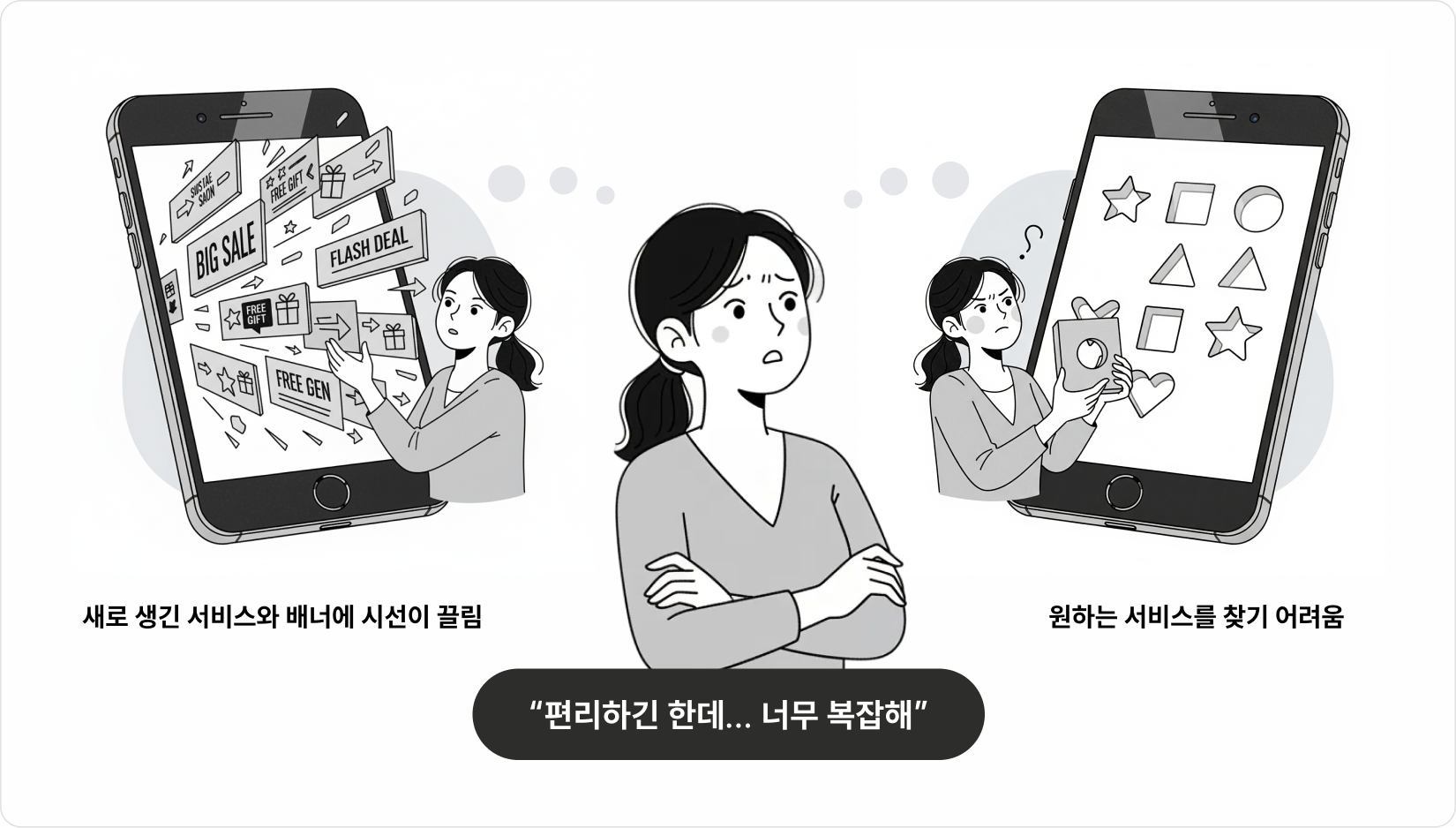 금융, 생활, 커머스 등 각종 서비스와 기능이 한 화면 안에서 서로 부딪히다 보니 사용자는 어느 순간 “내가 이 앱을 왜 켰더라?”하면서 잊어버리고 맙니다. 앱을 들어가면 새로 추가된 메뉴와 배너에 시선이 계속 끌린다던지, 또는 원하는 기능을 찾을려고 여러 번 메뉴를 드나드는 일이 반복됩니다. 원하는 서비스를 못찾으면 다시 홈화면으로 돌아와 처음부터 다시 길을 찾는 경험도 자주 생깁니다.