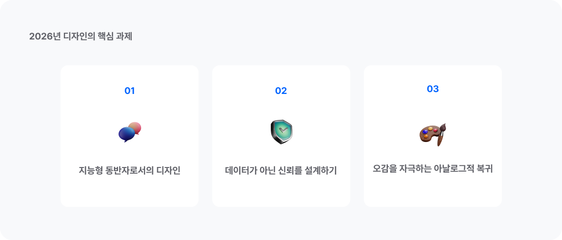 이번 리포트를 통해 살펴본 2026년 디자인의 핵심 과제는 다음 세 가지로 요약됩니다.