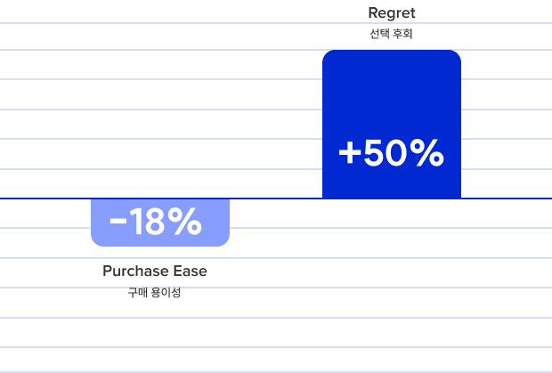 반면, 선별된 선택지 제안(Prescriptive Approach)은 고객 구매경험에 긍정적 결과를 만들었습니다. 구매 용이성 86% 향상되고 후회는 37% 감소 했습니다. 따라서 선별된 선택지는 고객의 구매 용이성을 높이고 구매 후회 가능성을 줄일 수 있습니다.