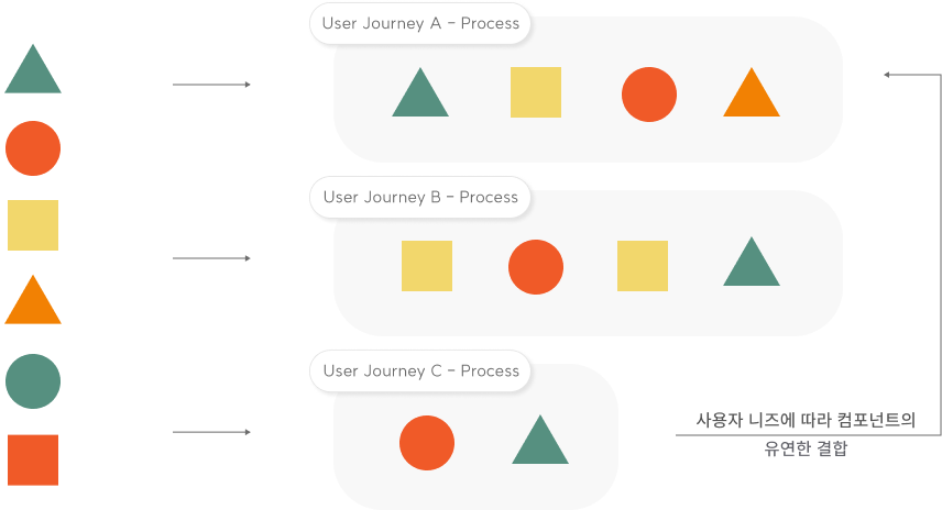 컴포넌트의 유연한 결합을 통해 보다 사용자의 맥락과 니즈에 부합하는 경험을 제공할 수 있습니다. 서비스 간에는 사용자 데이터 연동을 통한 기능 연결 및 콘텐츠 로의 확장성 기회를 제공 할 수 있습니다. 서비스 내부적 으로는 기능과 컴포넌트의 유연한 레이아웃과 기능에 대한 물리적 접근성 강화 , 개인화된 정보 제공기회를 만들 수 있습니다.
