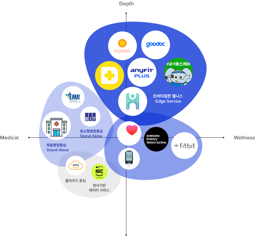 매디컬과 헬스케어 각각 영역의 특성을 보이며 다양한 서비스 모델을 구축하고 있습니다. 매디컬 영역은 병원이 주체가 되어 의료 Data-Driven 을 위한 보다 전문적인 서비스 환경을 구축해 나가고 있습니다.이를 위해 센서기반의 수집 데이터를 바탕으로 클라우드 기술을 적극 활용하고 있습니다. 웰니스 영역은 초버티컬화 된 Edge Service의 추세를 보입니다. 모바일 서비스를 중심으로 건강이나 습관에 도움을 주는등 삶의 전반에서 도움과 편의를 제공하려고 노력하는 모습을 보입니다.