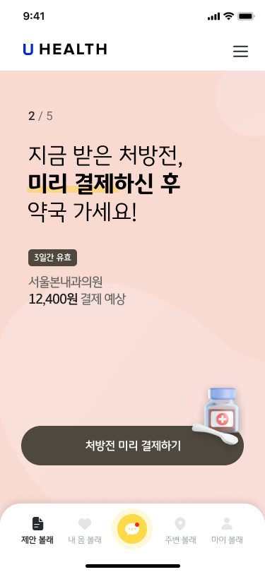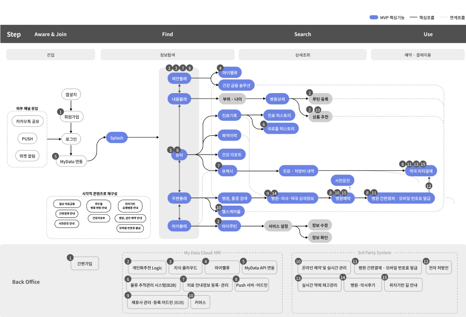 매디컬과 웰니스 영역을 모두 포함하는 통합된 사용자 여정을 제공 합니다. 이를 통해 생애주기 의료건강 정보 관리 서비스이자 플랫폼 역할을 제공 합니다. 내 건강 관찰 부터 능동적인 정보제안을 통해 일상에서도 적극적인 인터랙션을 제안 합니다. 의료 서비스가 필요한 경우는 맞춤형 의료기관을 추천하고 예약을 돕습니다. 병원 진료 이후에도 약국 방문전 결제까지 연계하여 도움을 제공 합니다. 모든 기록은 통합적으로 관리되며 상세한 진료 히스토리 또는 건별 기록열람기능과 처방된 의약품의 정보까지 제공 합니다.