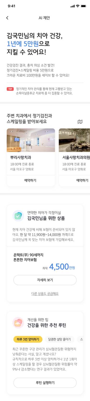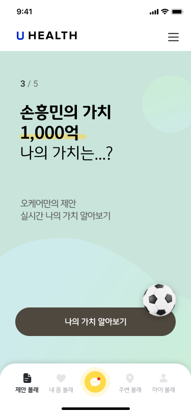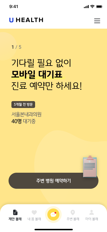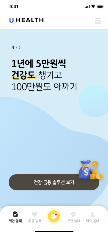 사용자 상황에 맞는 정보를 능동적으로 제안하는 기능 입니다. 맞춤형 정보를 통해 사용자와의 적극적인 인터랙션을 생성 합니다. 현재 의료 건강은 많고 어려운 정보가 파편화 되어 있습니다. 이로 인해 사용자의 다수는 정보를 제대로 활용하지 못하거나 오히려 의사결정을 어려움을 초래 합니다. ‘제안볼래'는 이에 대한 낮은 사용자 접근성을 돕고 개선을 의도할 수 있습니다.