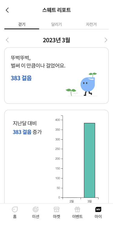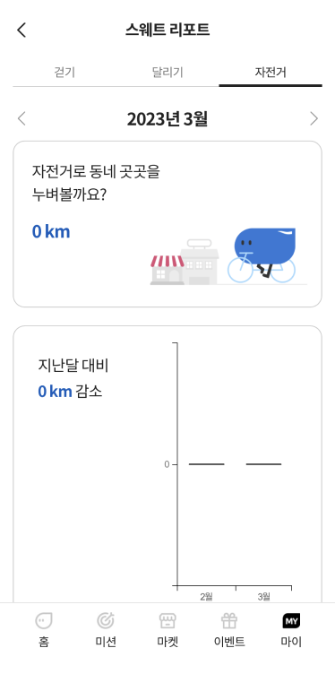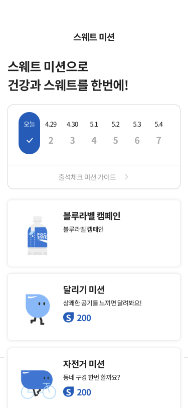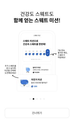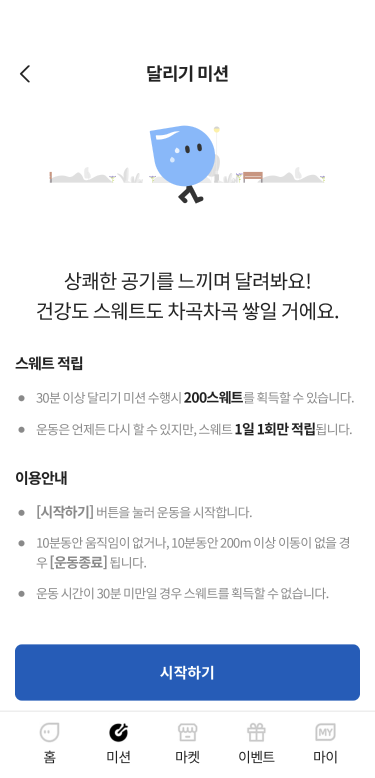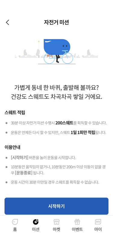 땀 흘린 만큼 포인트가 쌓이는 미션입니다. 미션을 성공하고 땀 흘리는 즐거움을 선사합니다. 목표를 설정하고 도전하는 달리기 미션과 자전거 미션으로 일상 속 운동하는 재미를 느낄 수 있습니다.
